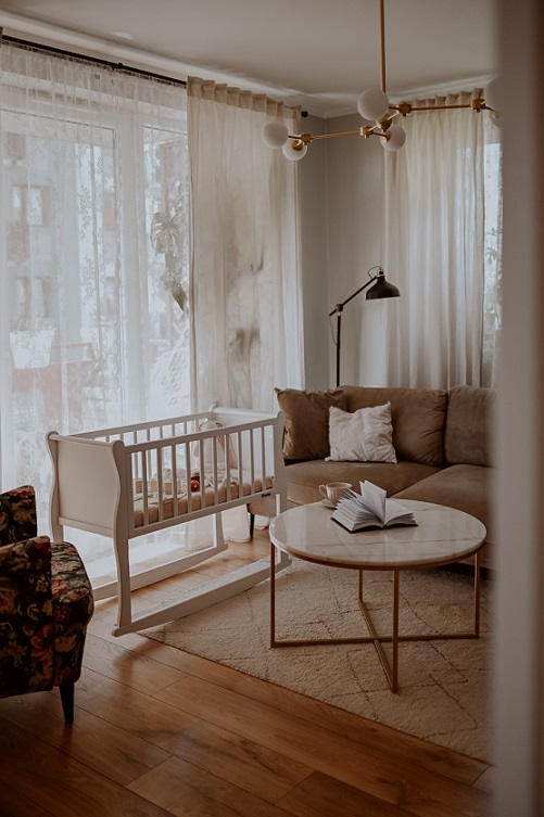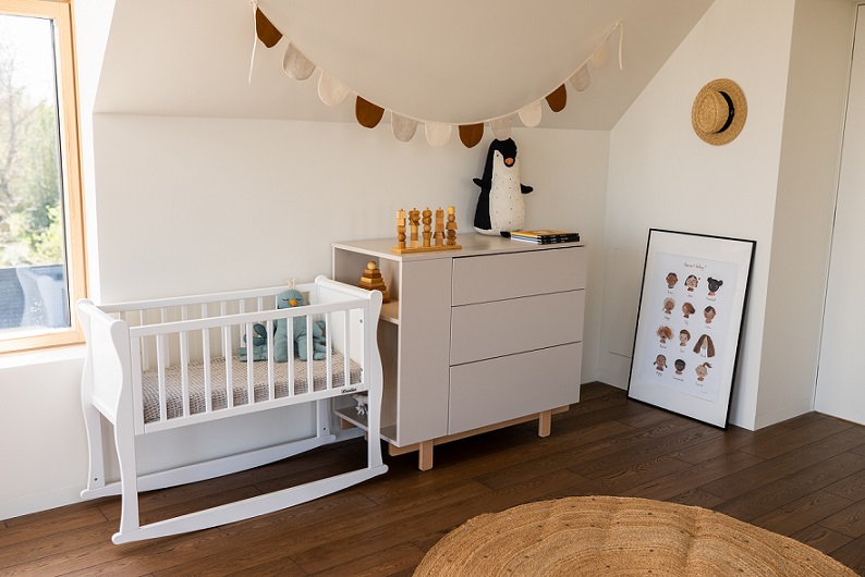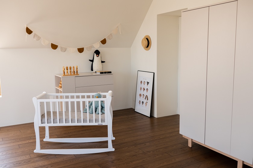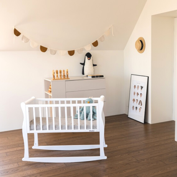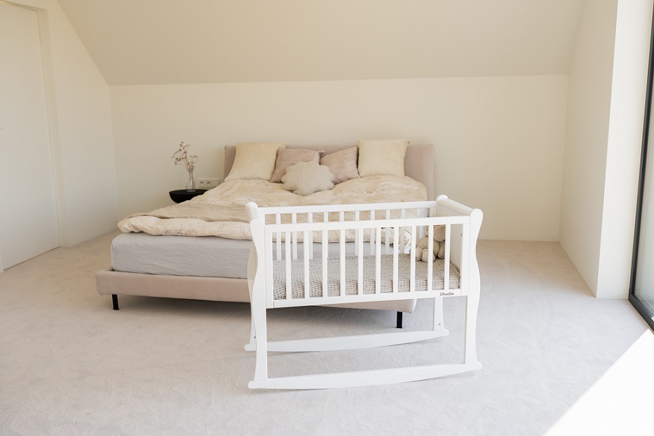 Underbar vit spädbarnssäng och babyvagga i romantisk stil som är perfekt som bebisens första säng!