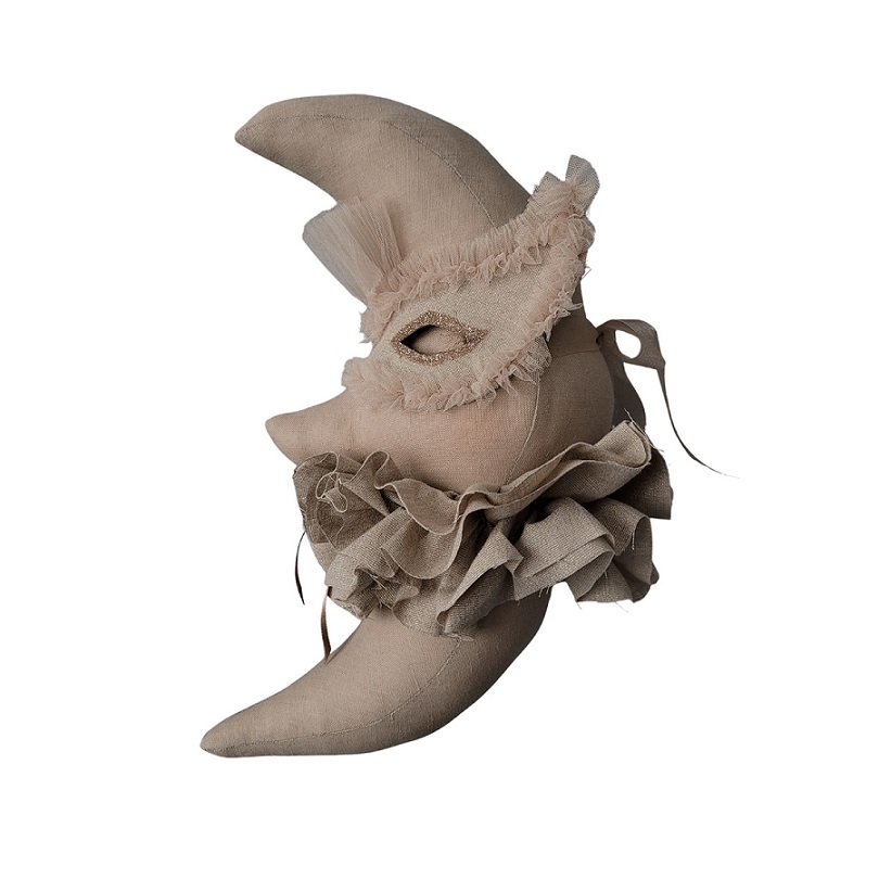 Skapa magi i ditt barnrum med denna förtjusande väggdekoration i form av en förtrollande måne med venetiansk ögonmask och krage!