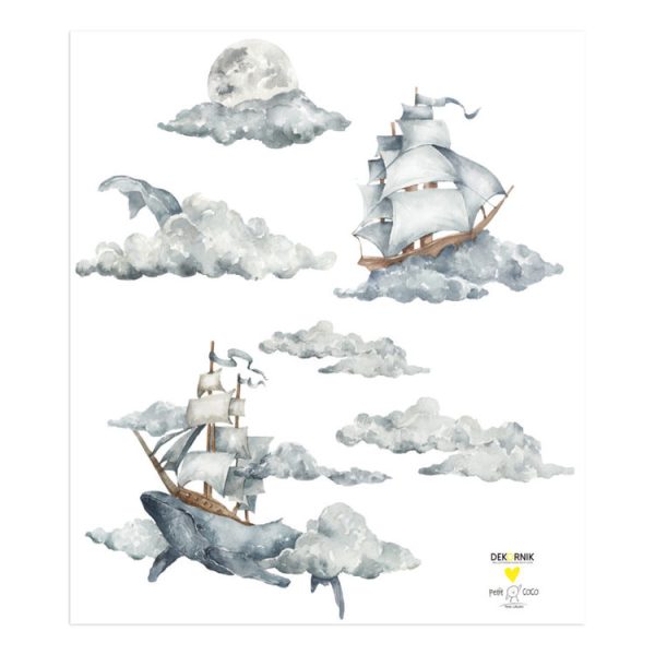 En underbar väggdekoration bestående av flertalet väggklistermärken som inspirerats av olika fartyg och resor. Detta är ett fantastiskt sätt att inreda ditt barnrum på, då den passar såväl vid sängen som vid skrivbordet eller på en tom helvägg i stället för tapet.