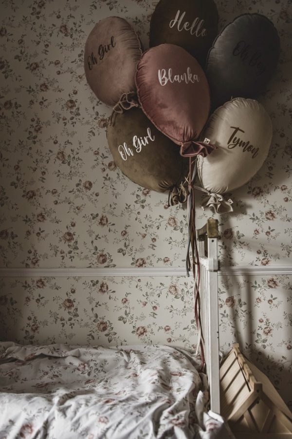 Superfin kudde i form av en ballong gjord av mjukt och härligt sammet som gör att den blir väldigt mysig att känna på. Ballongen kan även hängas upp på väggen tack vare den påsydda tygöglan på baksidan. Vare sig du använder den som kudde eller väggdekoration kommer den att vara fantastiskt vacker i barnrummet.