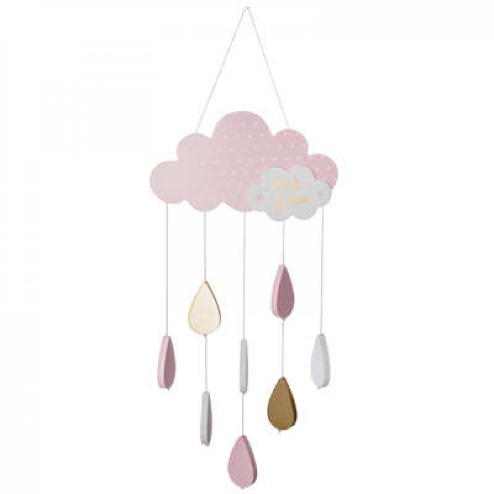 En mycket fin och elegant väggdekoration för de allra minsta i hemmet. Ditt barn kommer att älska att titta på på det fina molnet med vattendropparna.Du kan antingen hänga den under en sänghimmel eller på en vägg. Mått: 24 x 1,3 x 57,5 cmMaterial: Trä, bomull.