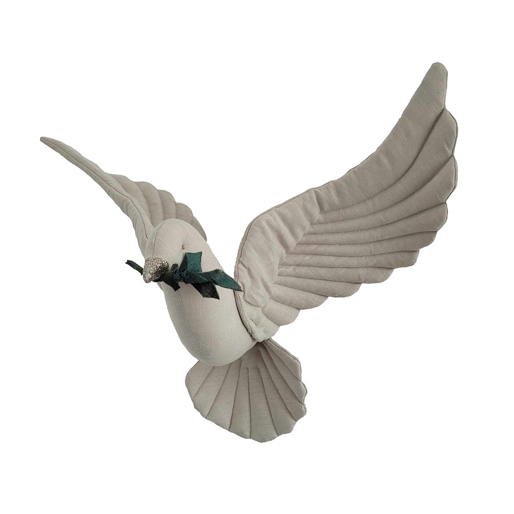 Superfin väggdekoration i form av en sandfärgad duva!Gjord av härligt tyg gör att denna duva är väldigt mjuk och mysig att känna på samtidigt som det är en fantastiskt vacker dekoration till barnrummet.Produkten är förberedd för att hänga upp på väggen med påsydda hängare. Sätt bara fast en limmad krok på väggen och sen sätter du dit den.Mått: 45 × 35 × 20 cmMaterial: 100% linneDesigner: Love me…