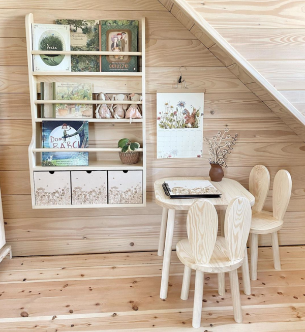 En fantastisk vägghylla för barnrummet som du själv kan ändra utseende på beroende på vad som placeras på den. Det är en rymlig bokhylla där barnet kan lagra sina mest värdefulla ägodelar och sina finaste böcker. Samtidigt med tre fina lådor för en bra förvaring.