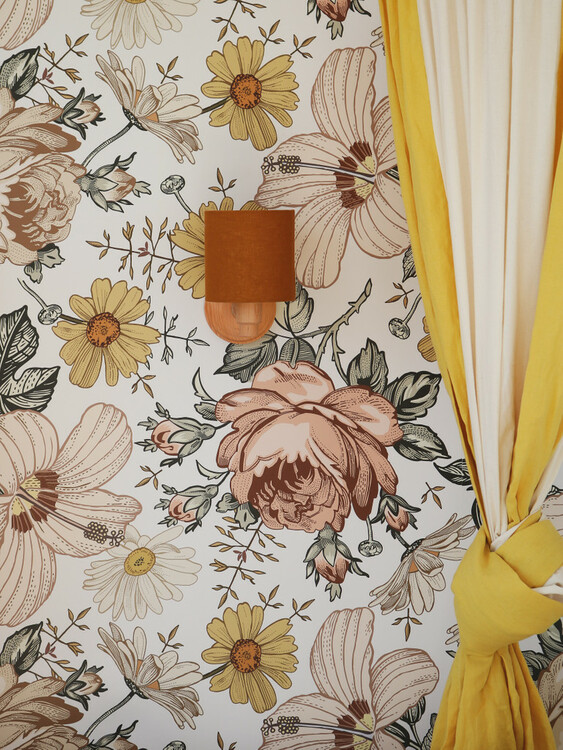 Vägglampan är gjord i bokträ och textilen på lampskärmen är gjord i 100 % linne.