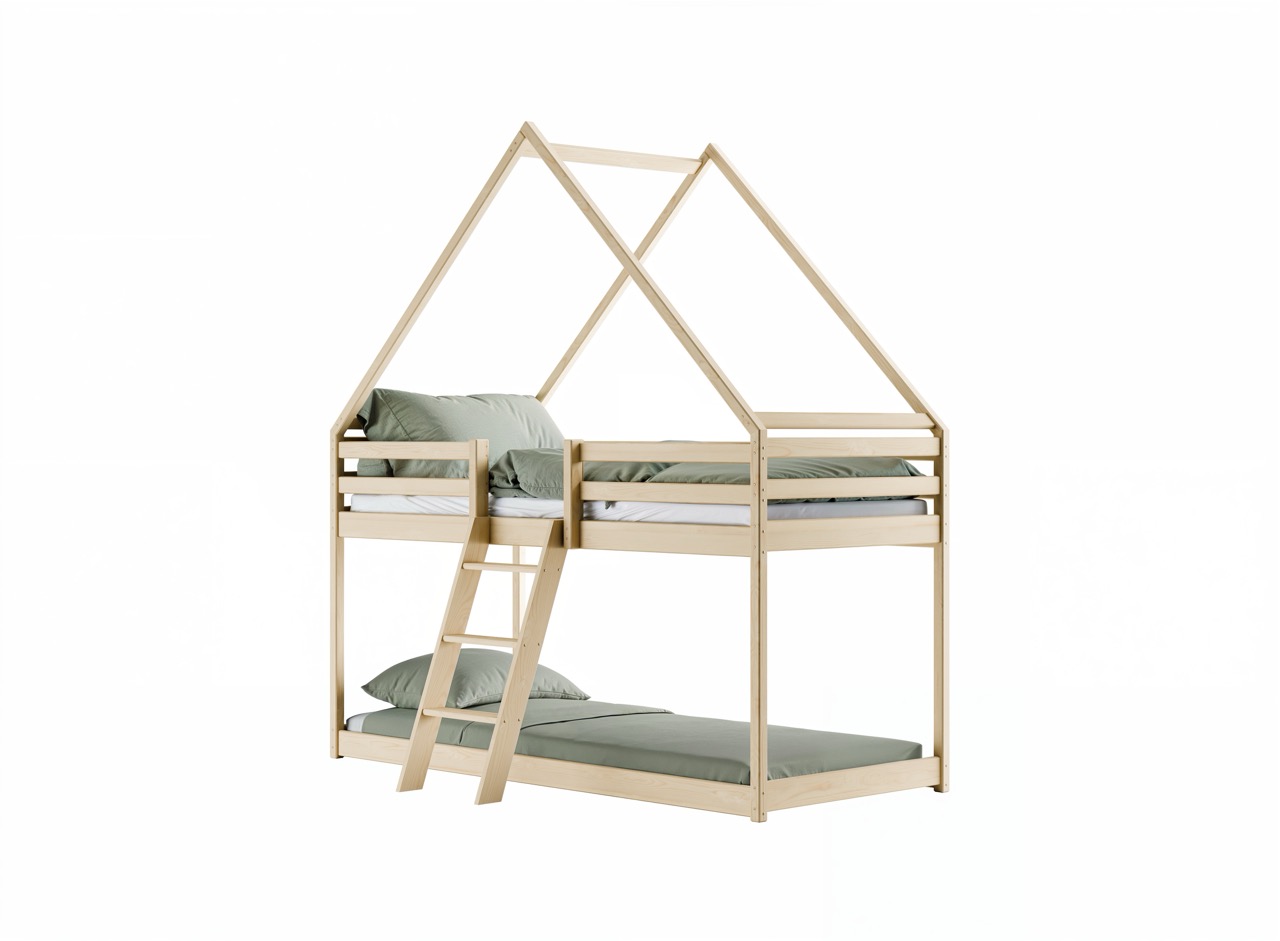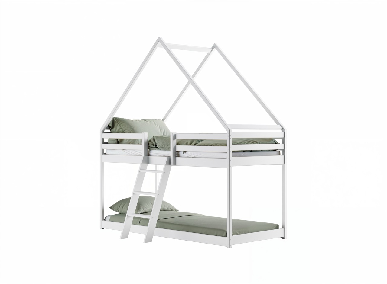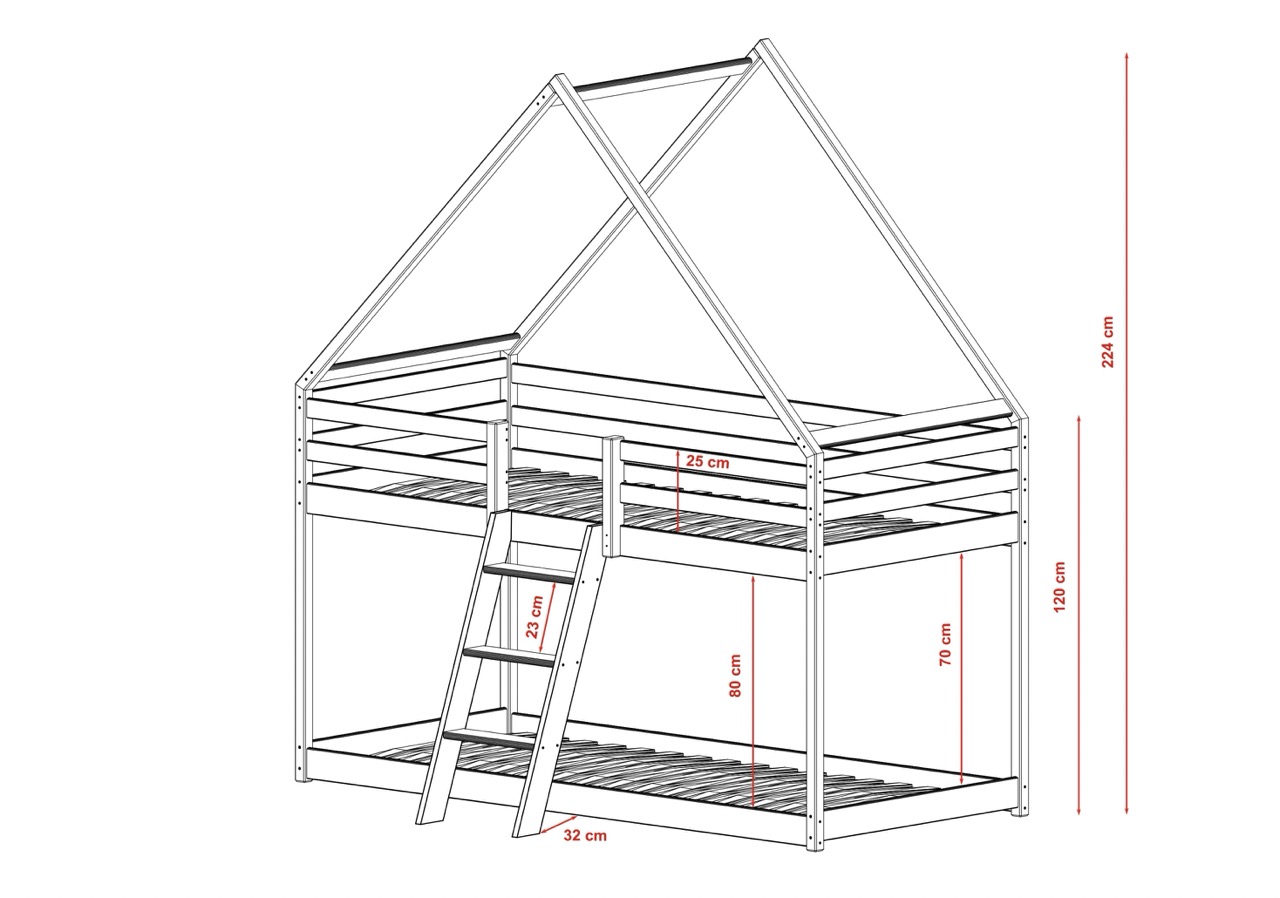 Upptäck en våningssäng som kombinerar funktionalitet med lekfull design. Denna charmiga hussäng är tillverkad i massiv furu ? stabil, rejäl och skapad för att följa med i barnets vardag under många år.