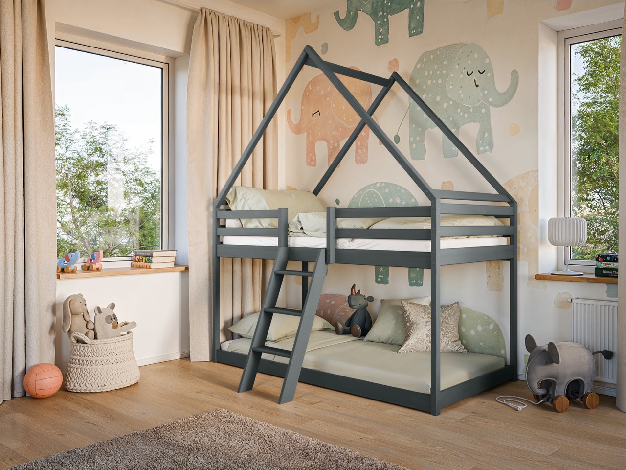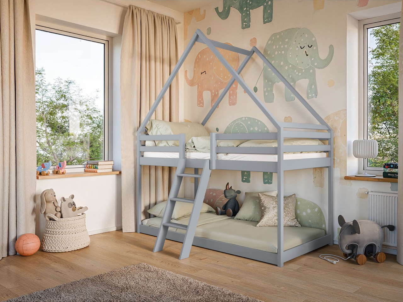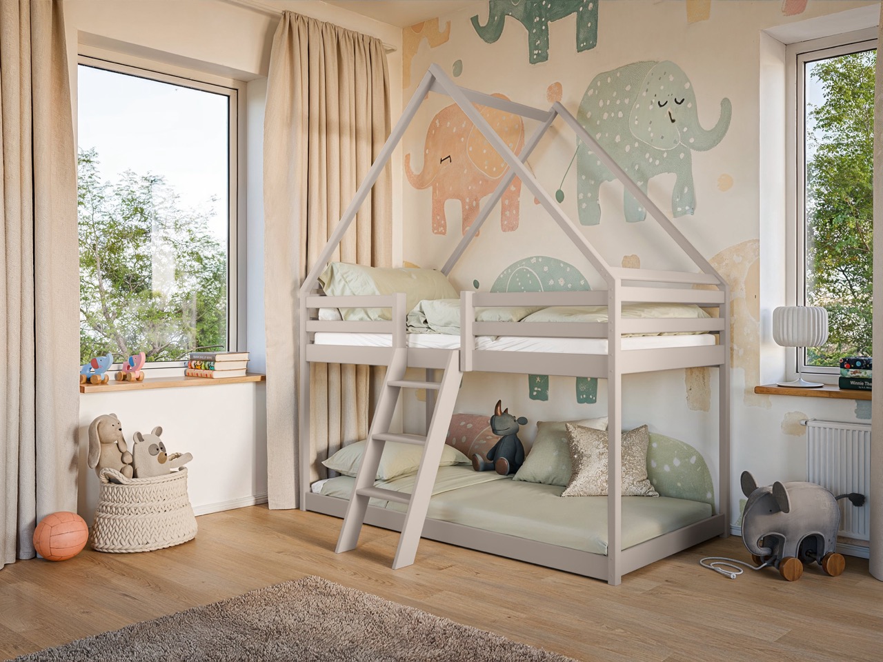 Upptäck en våningssäng som kombinerar funktionalitet med lekfull design. Denna charmiga hussäng är tillverkad i massiv furu ? stabil, rejäl och skapad för att följa med i barnets vardag under många år.