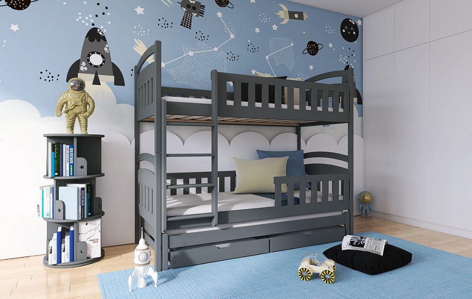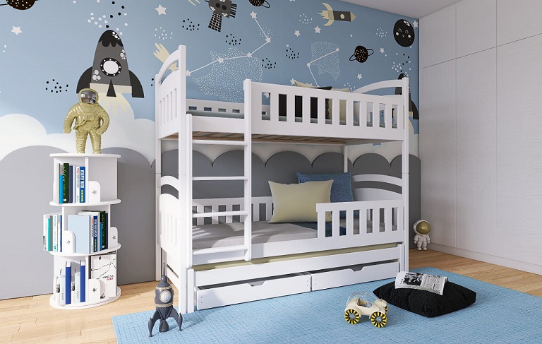 På vår fina syskonsäng Arthur har man tänkt till ordentligt för att optimera golvytan i barnrummet. Vi lovar att sängen kommer bli dina barns favorit, och inte bara för att sova i då den med enkla medel kan bli en riktigt bra myshörna. Många dekorerar med sänghimlar, vimplar eller ljusslingor, bara din kreativitet sätter stopp.