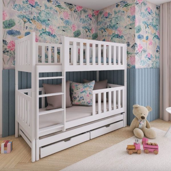 På vår fina syskonsäng Lilly har man tänkt till ordentligt för att optimera golvytan i barnrummet. Vi lovar att sängen kommer bli dina barns favorit, och inte bara för att sova i då den med enkla medel kan bli en riktigt bra myshörna. Många dekorerar med sänghimlar, vimplar eller ljusslingor, bara din kreativitet sätter stopp.