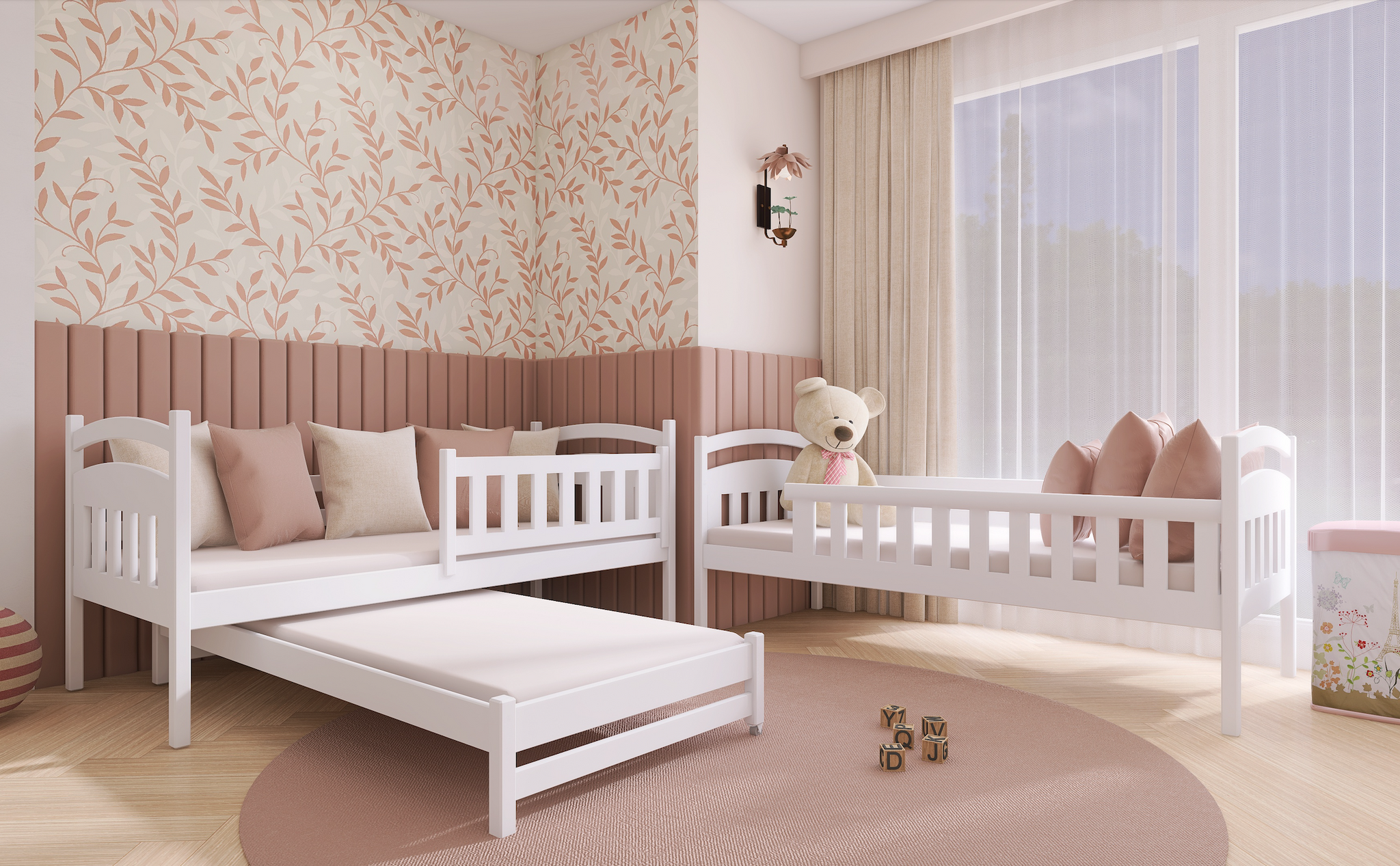 På vår fina syskonsäng Betty har man tänkt till ordentligt för att optimera golvytan i barnrummet. Vi lovar att sängen kommer bli dina barns favorit, och inte bara för att sova i då den med enkla medel kan bli en riktigt bra myshörna. Många dekorerar med sänghimlar, vimplar eller ljusslingor, bara din kreativitet sätter stopp.