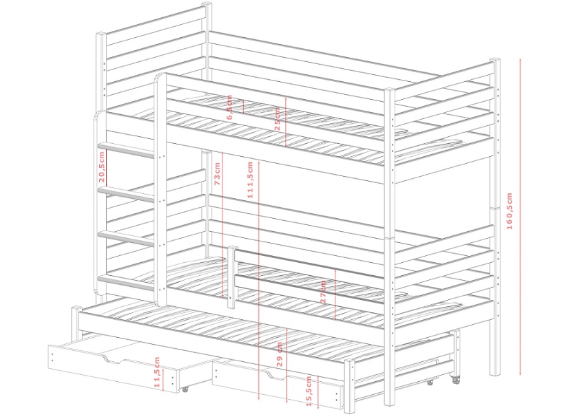 - Stödbrädans höjd på den översta sängen: 25 cm.