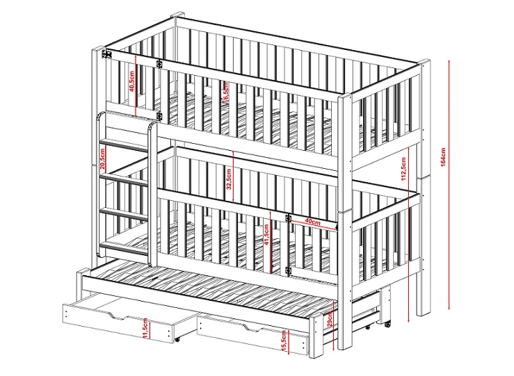 • Stödbrädornas höjd: 41,5 cm. Avstånd mellan spjälor 6,5 cm.