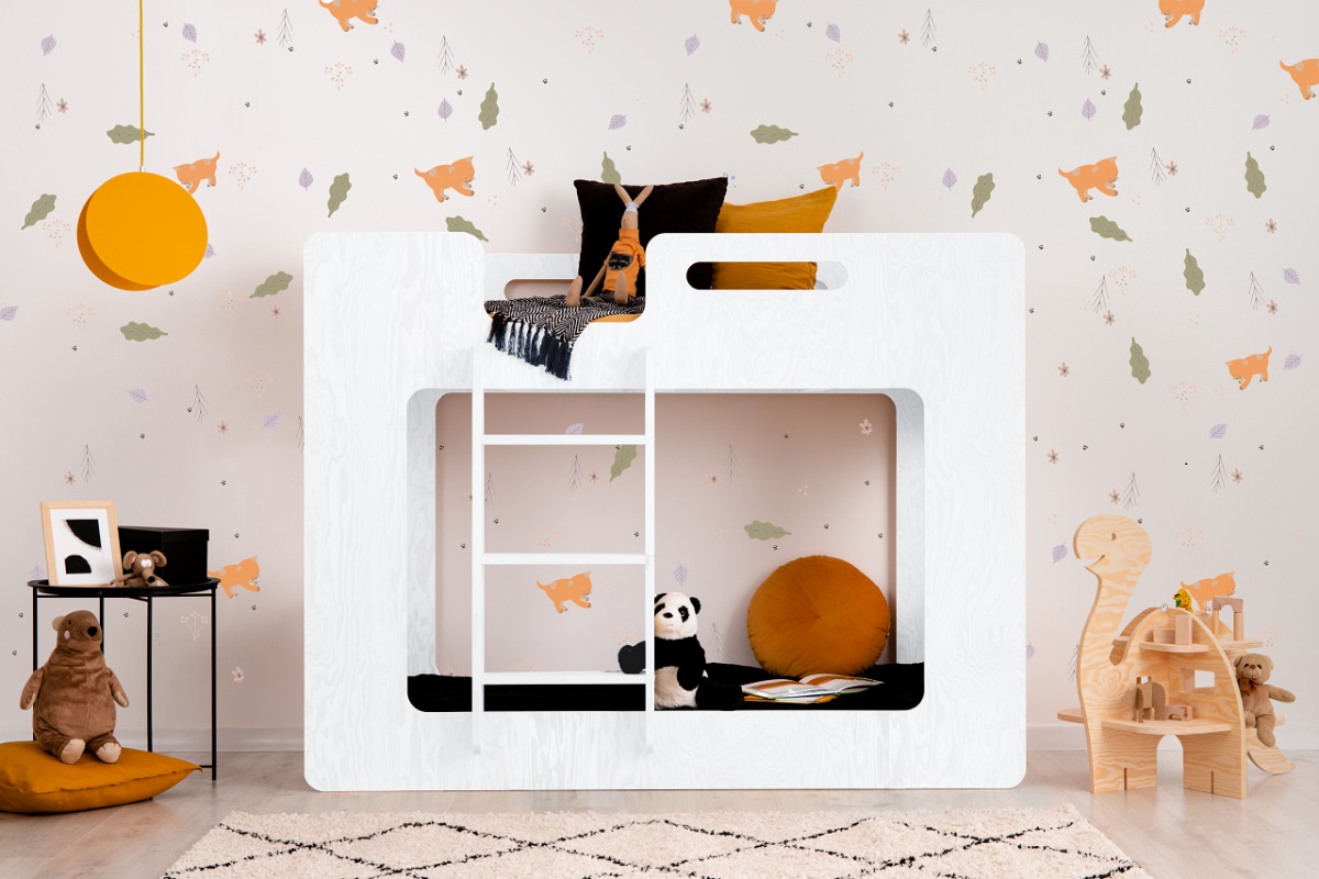 På vår fina våningssäng Simba har man tänkt till ordentligt för att optimera golvytan i barnrummet och öka mysfaktorn i barnrummet.