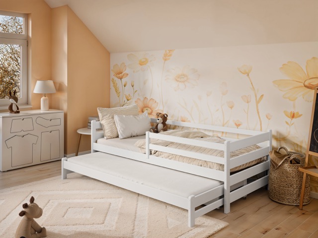Sängen är utrustad med en utdragbar sängdel som enkelt omvandlar den till två bekväma sovplatser i olika höjd ? perfekt för syskon eller övernattande kompisar. Trots det extra sovutrymmet tar den inte upp mer plats än en vanlig enkelsäng.