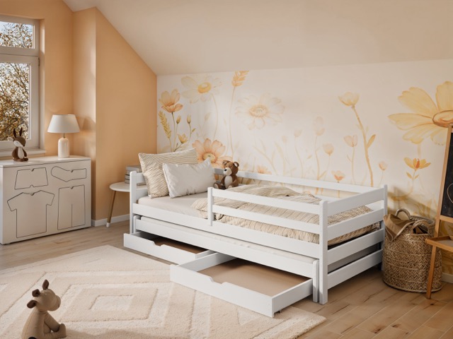 Den medföljande sängkanten ger extra trygghet, vilket gör sängen till ett säkert val även för yngre barn. Ramen är försedd med flexibla björk-lameller som ger god komfort och tål daglig användning. Under sängen finns dessutom rymliga lådor ? perfekta för att förvara sängkläder, leksaker eller kläder på ett smidigt sätt.