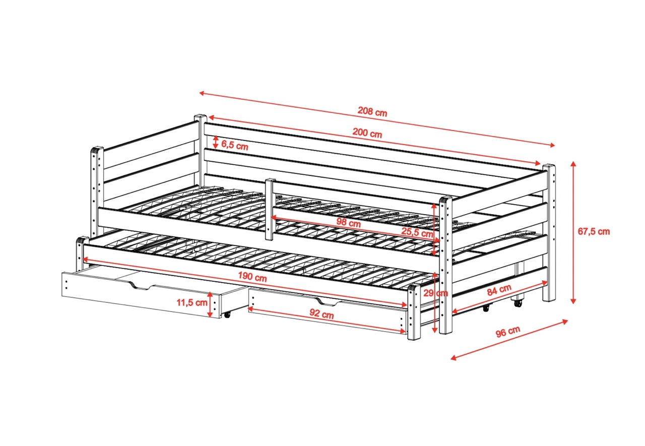 - Sängens totala dimensioner: 96×208 cm