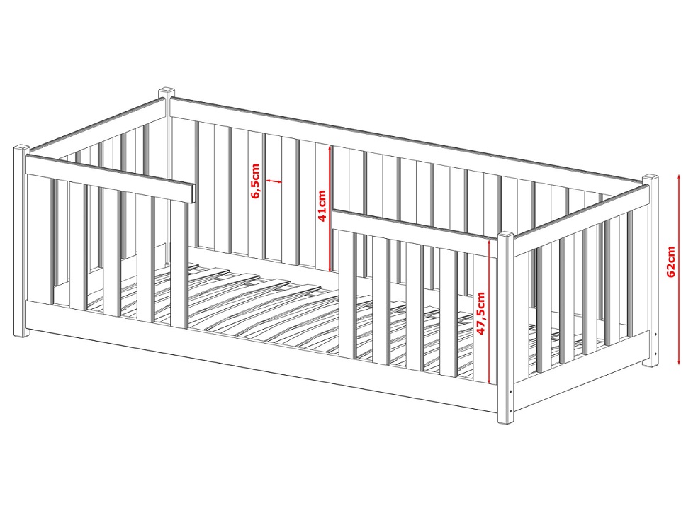 - Stödbräda höjd när den är monterad: 47,5 cm. Avstånd mellan spjälor 6,5 cm.