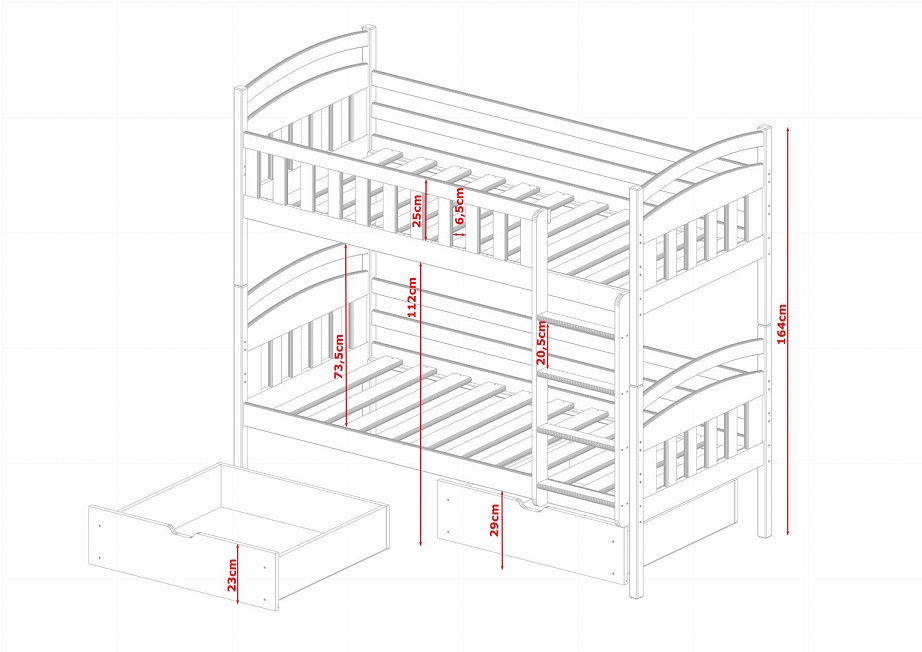 - Stödbrädornas höjd: 25 cm. Avstånd mellan spjälor 6,5 cm