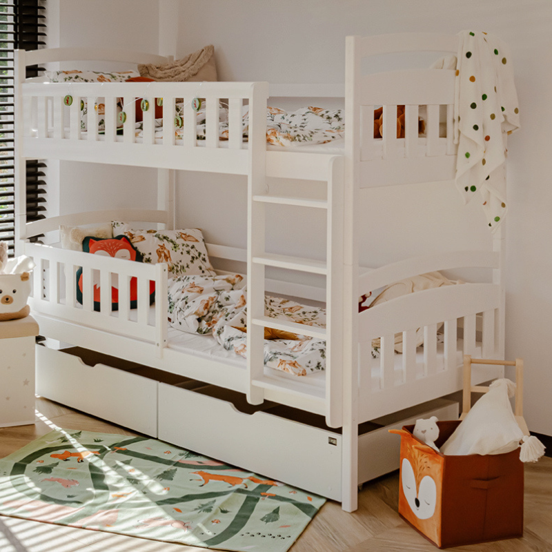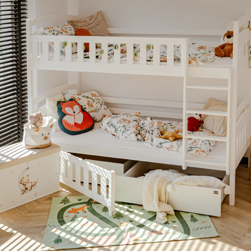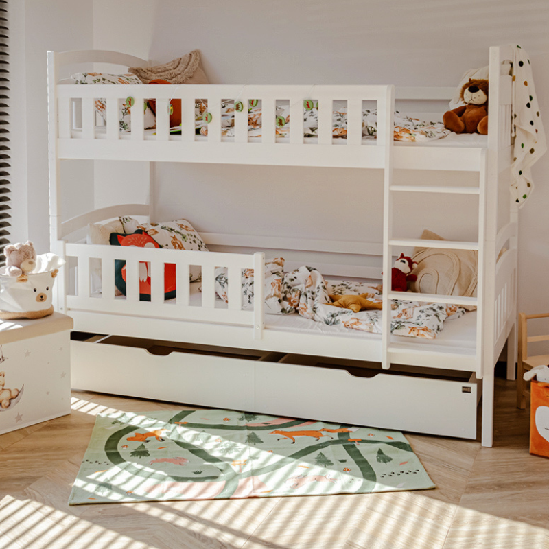 Sängarna tillverkas enligt standarden EN-747-1: 2012 + A1: 2015 i vår fabrik i Europa som har de högsta säkerhetsstandarderna för produktion av barnsängar. och kontrollerar varje steg från det att timret kommer in i fabriken till att en färdig produkt lämnar. Sängarna lackeras tre gånger med ekologisk, miljövänlig och vattenbaserad färg som följer normen EN 71-3:2019.