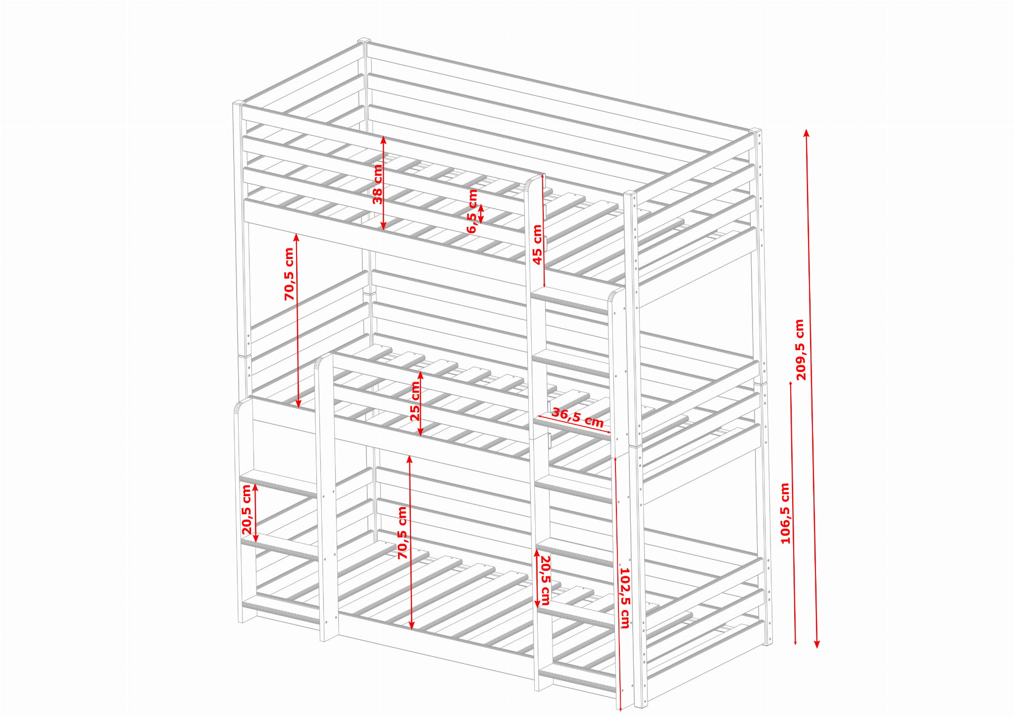 • Höjd på stödbrädan på den mellersta sängen: 25 cm