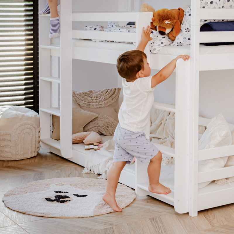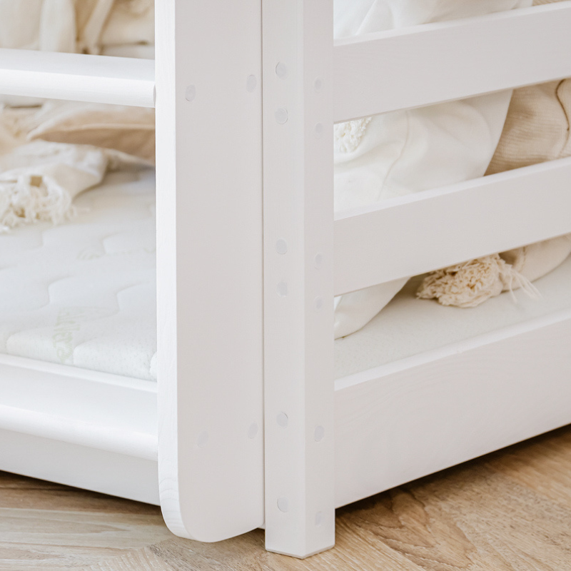Sängarna tillverkas enligt standarden EN-747-1: 2012 + A1: 2015 i vår fabrik i Europa som har de högsta säkerhetsstandarderna för produktion av barnsängar. och kontrollerar varje steg från det att timret kommer in i fabriken till att en färdig produkt lämnar. Sängarna lackeras tre gånger med ekologisk, miljövänlig och vattenbaserad färg som följer normen EN 71-3:2019.