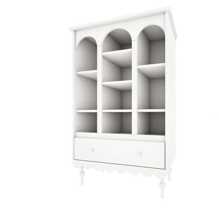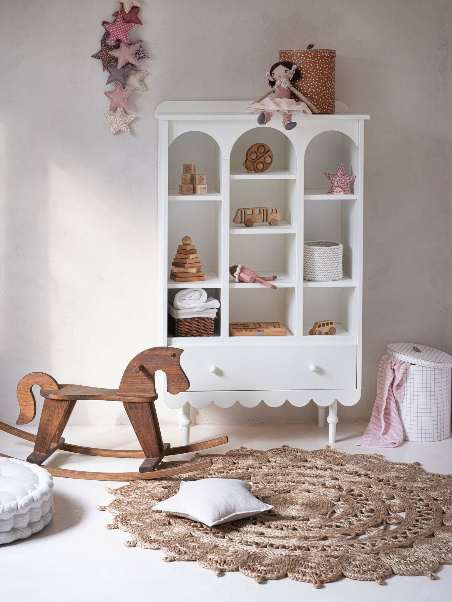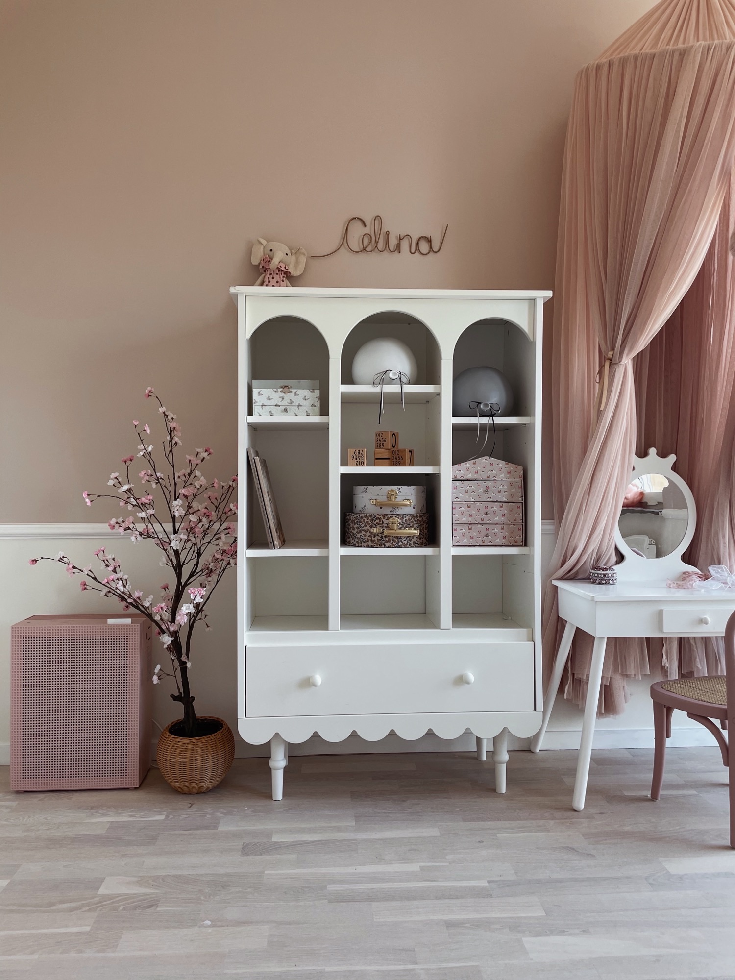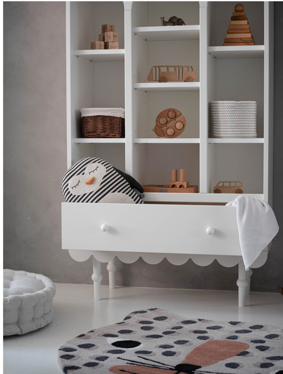 En riktig dröm för barnrummet, det är skåpet Babushka som är så vacker att den även passar in i föräldrarnas sovrum. Skåpet är helt byggd för hand av MDF och det ingår en massa charm och fina detaljer. Eller vad sägs om de fina  träbenen, och de vackra detaljerna på lådan.