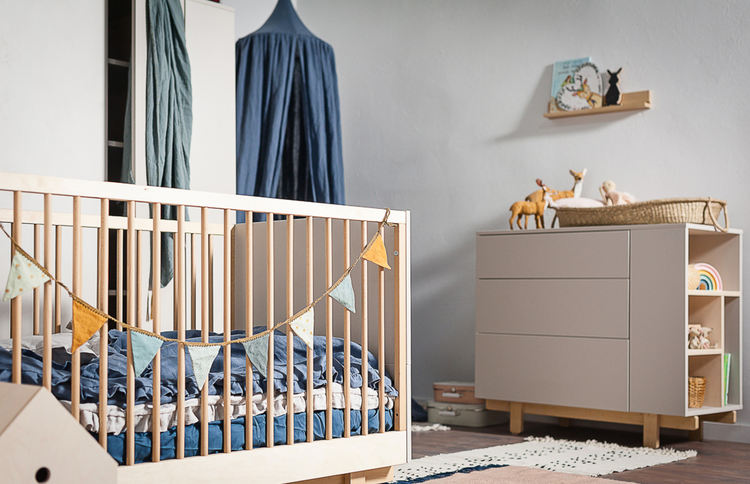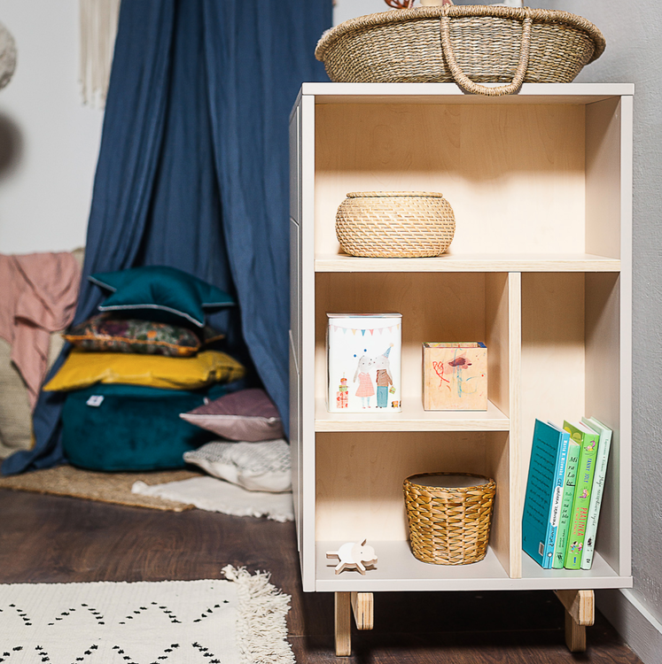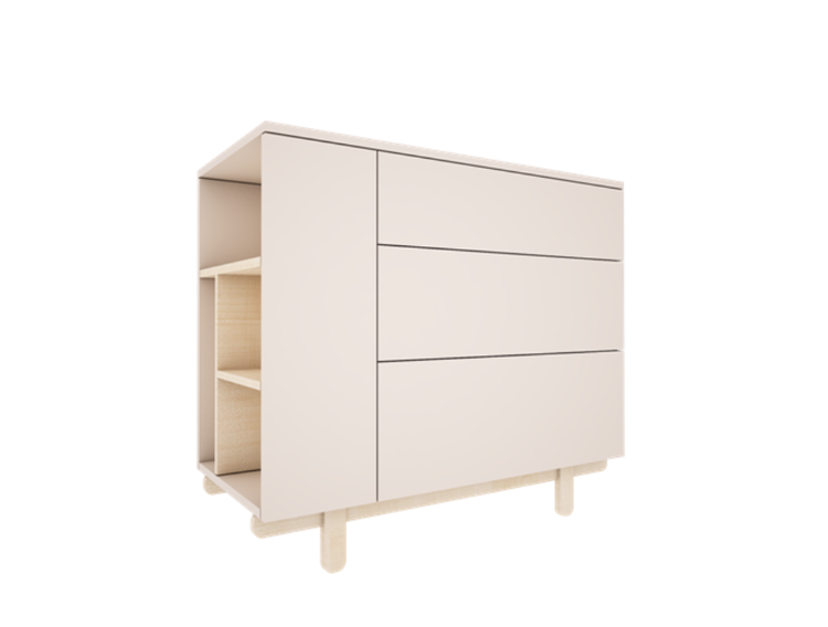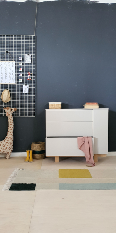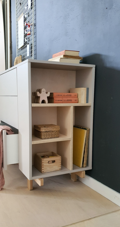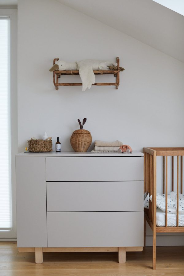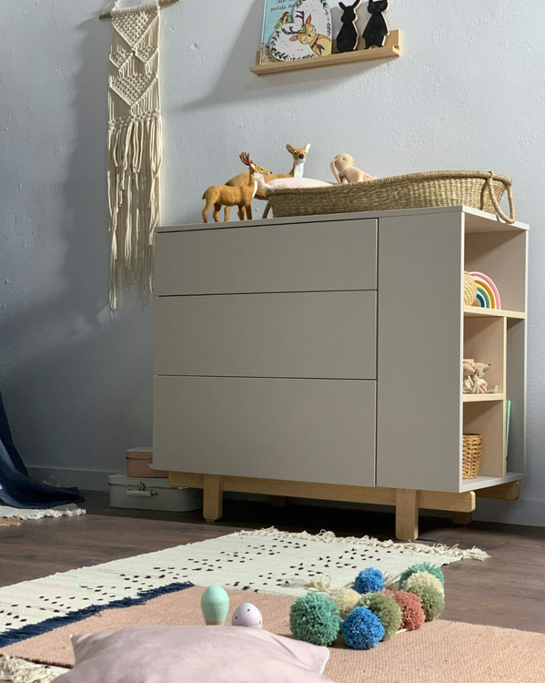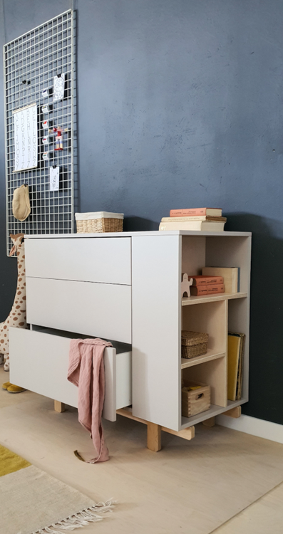 En riktig dröm för barnummet, det är byrå BASIC med praktiska hyllor på sidorna. Man väljer själv och monterar hyllorna på valfri sida. Skåpet är så vacker att den även passar in i föräldrarnas sovrum. Garderoben är helt byggd för hand av MDF och det ingår en massa charm och fina detaljer. En fantastisk möbel till barnrummet med flera fina detaljer och rejält med utrymme för kläder och förvaring.